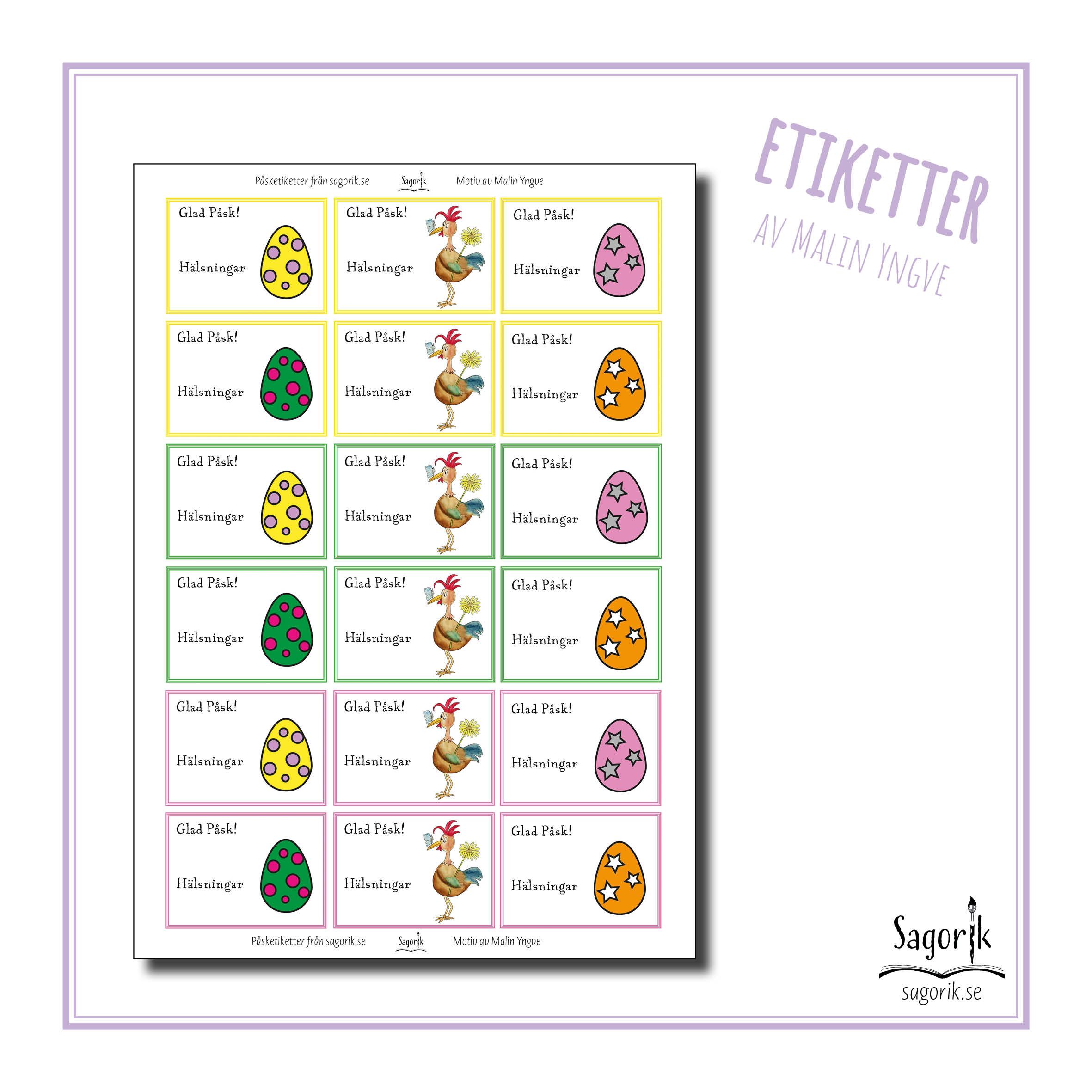 Etiketter med texten ”Glad Påsk! Hälsningar”. Kan användas att sätta på små påskpresenter till klassen eller förskolebarnen. Barnen kan också sätta dem på egengjorda presenter att ge bort till någon i deras familj. Motiv och design av Malin Yngve.
