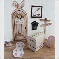 Gör påsken extra magisk och mysig för barnen med detta charmiga kit där påskharen flyttar in hemma eller i klassrummet! Med en dörr, små söta tassavtryck, en egen flyttlåda och fina dekorationer blir det enkelt att skapa en fantasifull och glädjefylld påskmiljö.