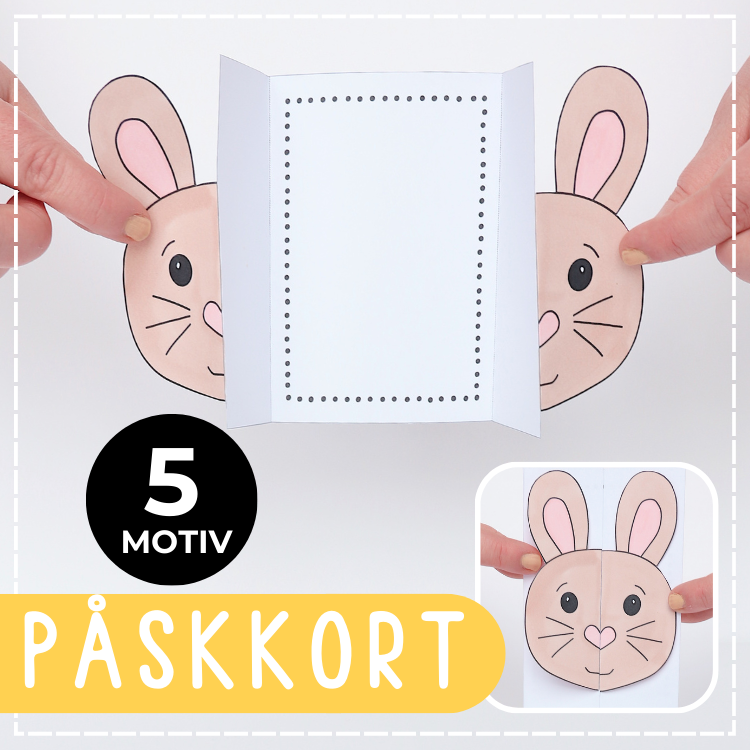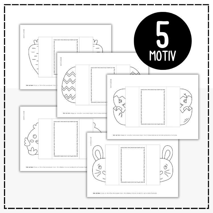 Påskpyssel: mallar till fem öppningsbara påskkort att färglägga, klipp ut och vika ihop. I kortet skriver du själv ett eget meddelande. Motiv: kanin, ägg, kyckling, morot och kyckling i ett ägg.
