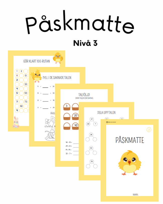 Häftet innehåller blandade uppgifter med addition och subtraktion mellan talområdet 0-100. Häftet innehåller även mönster, symmetri och talmönster.