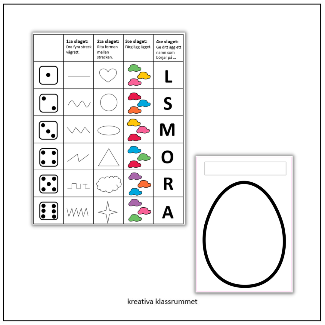 I rutan ovanför ägget skriver du det namn du tycker passar ditt ägg. Tärningen talar om vilken bokstav namnet ska börja på.