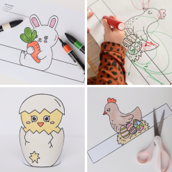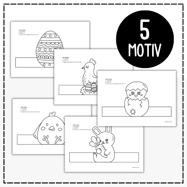 Mallar för att pyssla egen påskdekoration. Figurerna kan stå upp med hjälp av remsan som tejpas ihop till en ring på baksidan. Perfekt till årets påskpyssel. Produkten innehåller fem motiv: kyckling, kanin med morot, höna, kyckling i ägg och påskägg.