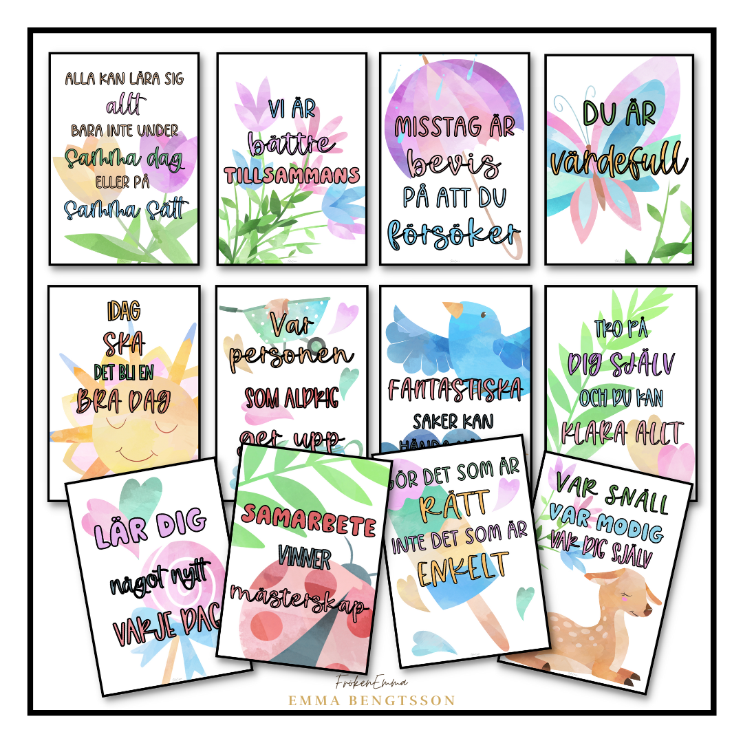 Här är 12 olika posters med vårtema. Alla posters innehåller peppande och motiverande budskap riktat till eleverna. Sätt upp i klassrummet eller i skolans korridorer. Skriv ut och laminera eller rama in.