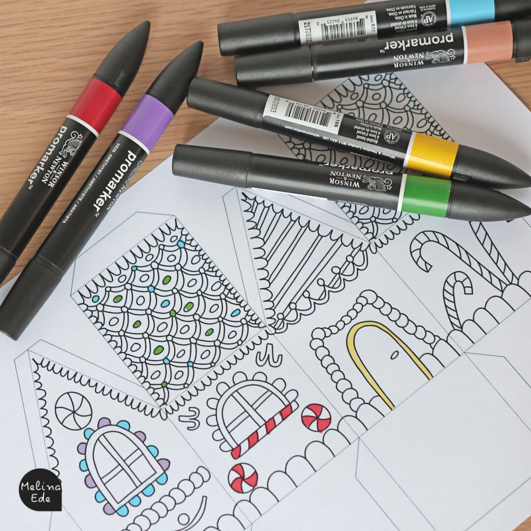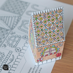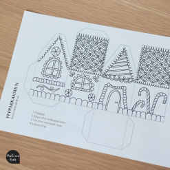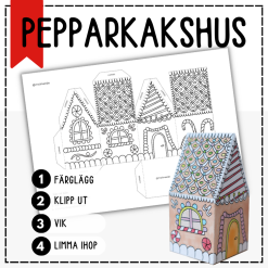 Julpyssla ett pepparkakshus i 3D. Skriv ut mallen, färglägg och limma ihop till ett pepparkakshus.