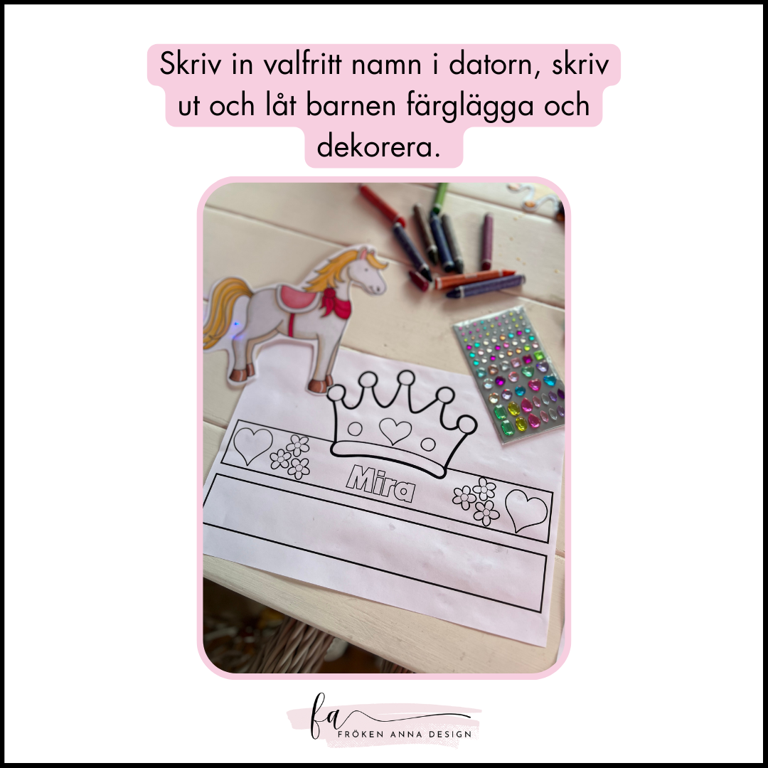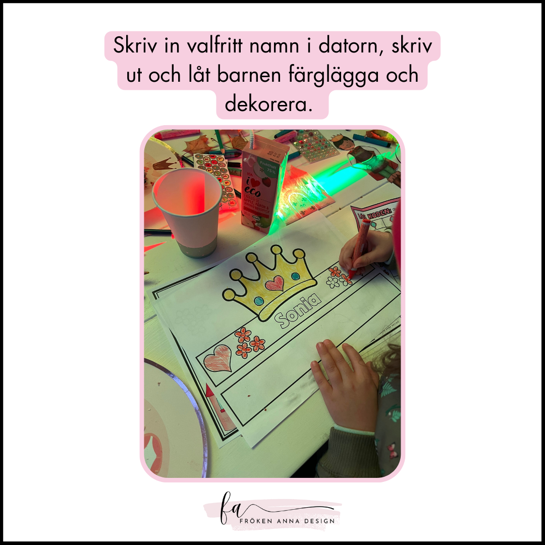 Skapa roliga namnkronor som barnen får färglägga och dekorera. Perfekt att ha på t.ex. kalas, när något barn fyller år i skolan eller förskolan eller vid en terminsstart. Filen är redigerbar i PowerPoint så du själv kan skriva in barnens namn innan du skriver ut dokumentet.