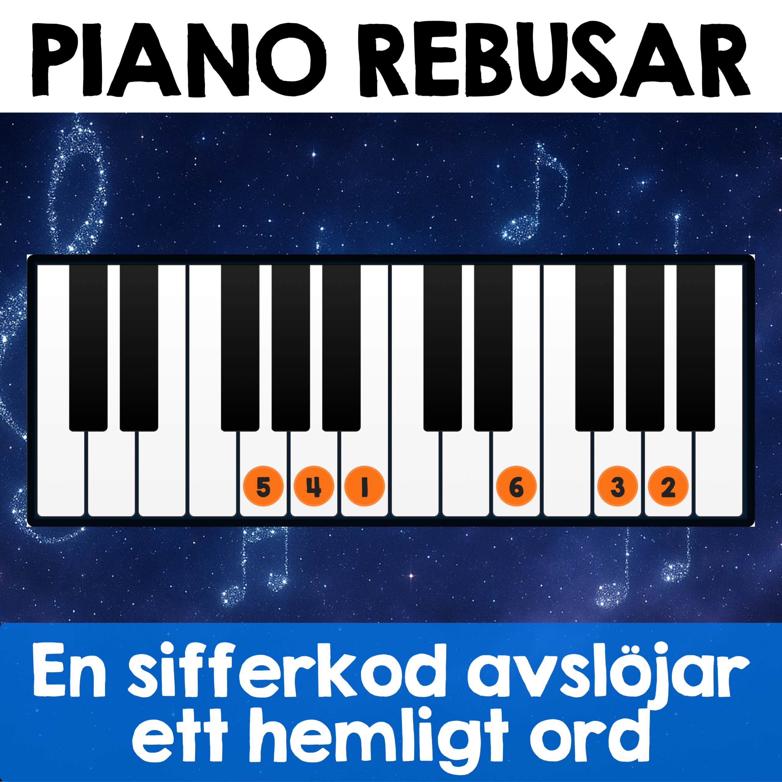 - 10 olika piano-rebusar med tydliga tangentbilder