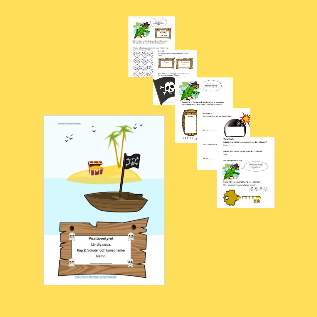 Vidare instruktion: För att motivera eleverna ska de följa papegojan på jakt efter skatten. I slutet av varje kapitel finns en nyckel där eleverna samlar en bokstav. Efter alla kapitel är avslutade får eleverna ett ord på nyckeln och de har då hittat skatten. Skatten är ett diplom som kommer med kapitel 5.