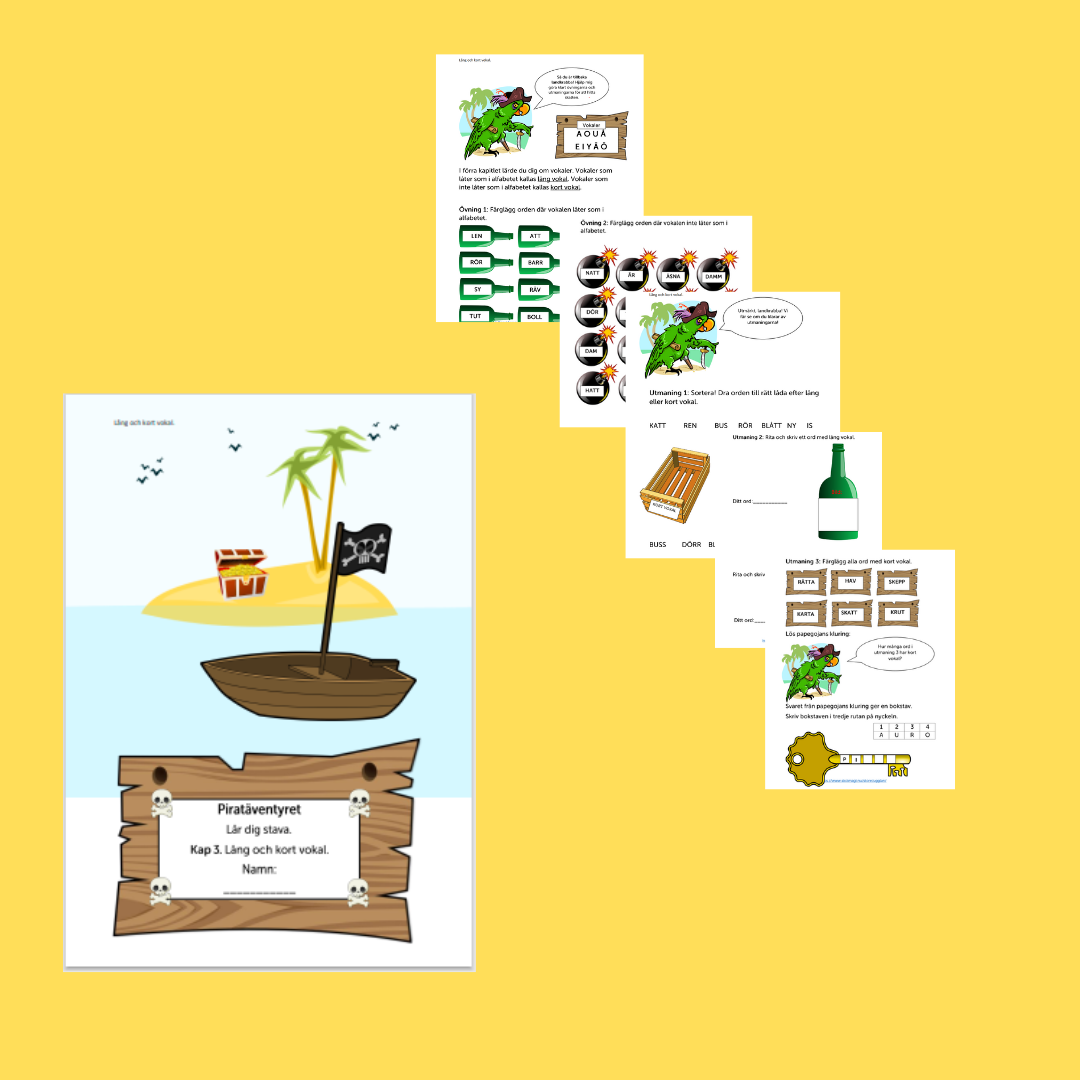 Vidare instruktion: För att motivera eleverna ska de följa papegojan på jakt efter skatten. I slutet av varje kapitel finns en nyckel där eleverna samlar en bokstav. Efter alla kapitel är avslutade får eleverna ett ord på nyckeln och de har då hittat skatten. Skatten är ett diplom som kommer med kapitel 5.
