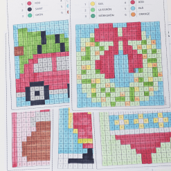 Färglägg pixlarna för att se det dolda motivet med tema jul. Koden består av siffror inom 1-6. Innehåller fem motiv: julkrans, tomtesäck, julkula, bil med gran och tomtens släde. Facit medföljer.