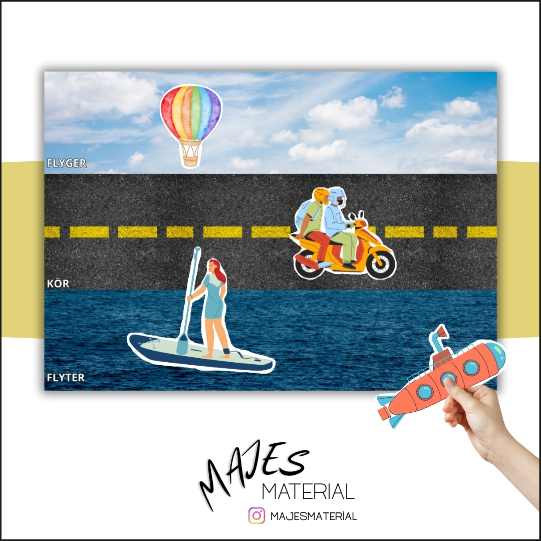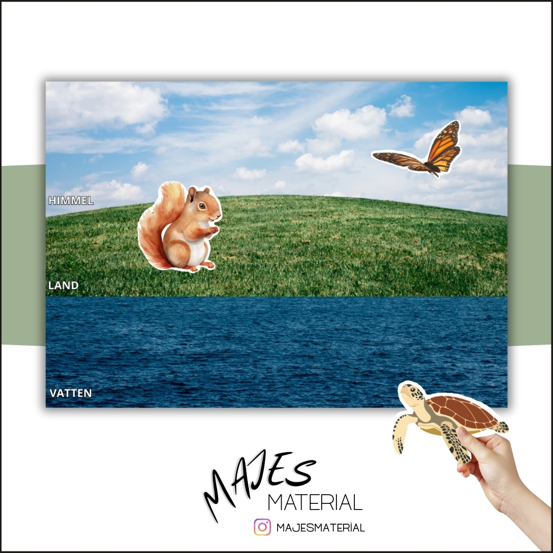 Skriv ut, klipp ut djuren/fordon, laminera och lägg ut djur/fordon på de platser de hör hemma.