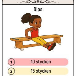 Poängträning kan användas både som uppvärmning och huvuduppgift. Totalt 30 blad med varsin övning som är uppdelad i 3 nivåer som ger 1, 2 eller 3 poäng. Du kan ge eleverna i uppdrag att som uppvärmning samla 15 poäng (eller vilken summa du tycker passar), alternativt att de ska försöka samla så många poäng de kan under en specifik tid. Samtliga blad är utformade på samma sätt utan numrering så du lätt kan välja vilka övningar du vill ha med under din lektion. Fungerar bra att laminera och sätta upp i idrotsshallen eller annan plats där aktiviteten äger rum. Vissa övningar ka kräva material som mattor, bänkar och liknande men du kan få ihop en bra aktivitet även med de övningar som inte kräver något alls. Eventuellt kan man erbjuda penna och papper till elever för att de ska ha koll på hur många poäng de samlat.
