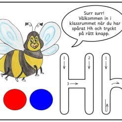 Som en ytterligare nivå trycker eleven på röd eller blå ”knapp” om det är en vokal eller konsonant. Eleverna lär av varandra och tittar och lyssnar på dem som står framför. Högen med portkoder växer allt eftersom vi lär ut flera bokstäver.
