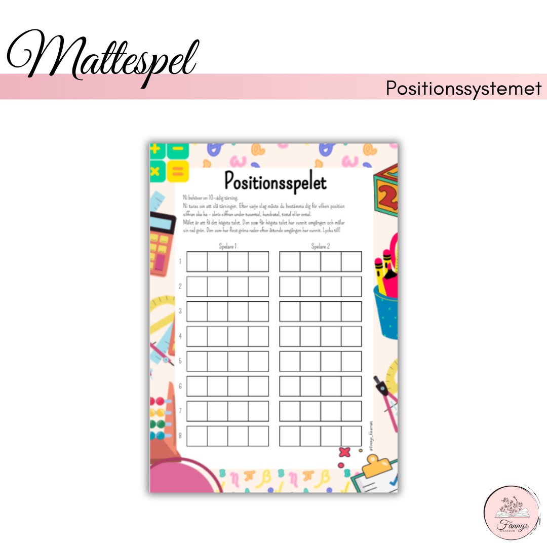 Ett spel där eleverna slår en tiosidig tärning och bestämmer vilken position siffran ska ha. Den som får det högsta talet får måla sitt tal grönt och den som har flest gröna tal när spelet är slut har vunnit.