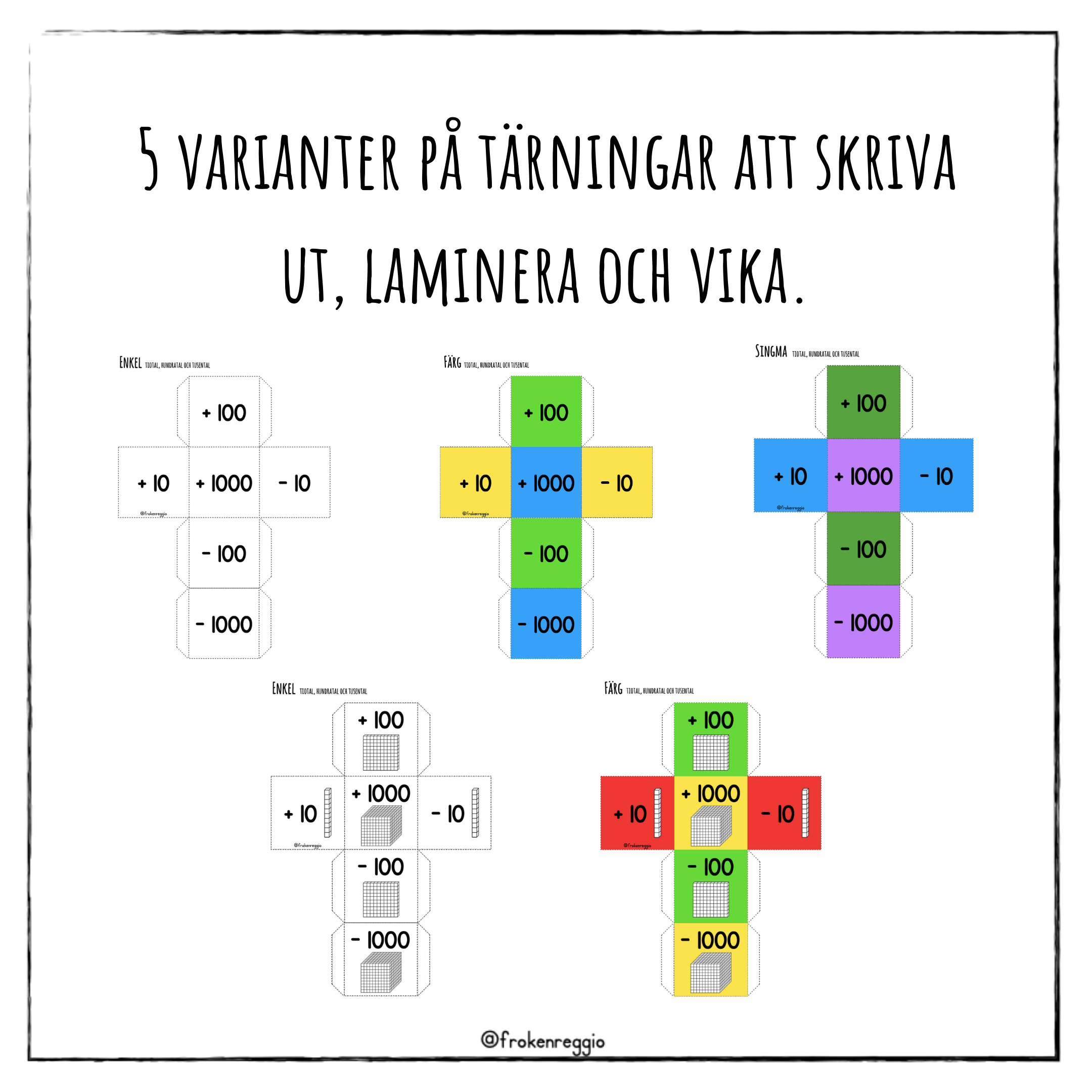 Materialet innehåller flera varianter på tärningar beroende på vad man föredrar samt arbetsblad.