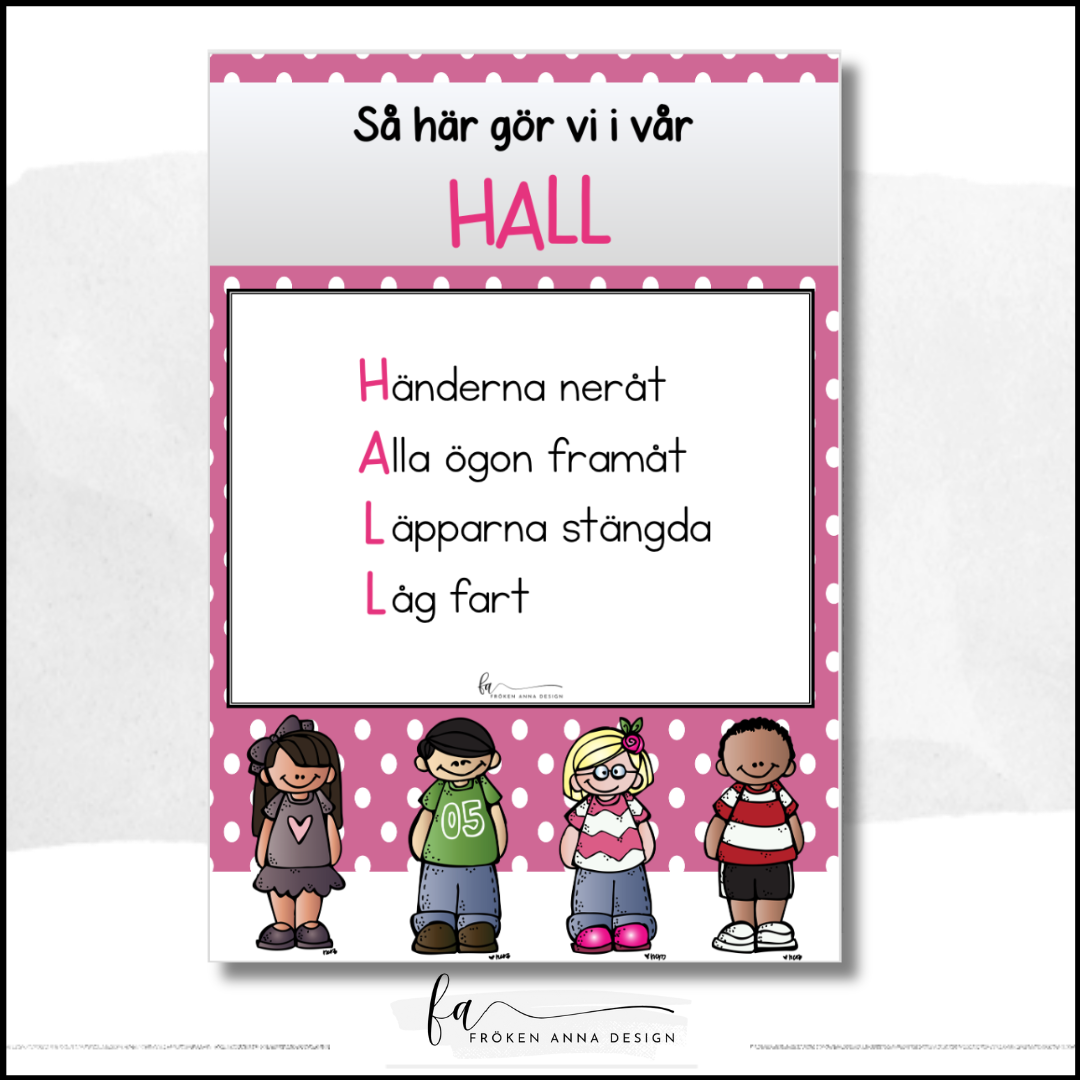 Hallen är en plats med många krav och osynliga regler, självklart för vissa och oklart för andra. Synliggör därför hur vi gör istället för inte gör med denna poster. Gå igenom den många gånger vad de olika bokstäverna H A L L står för, hur man konkret gör de olika uppmaningarna varför. Laminera postern och sätt upp på lämplig plats.