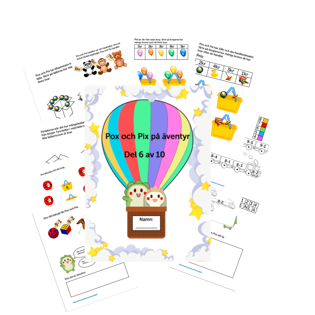 Pox och Pix på äventyr är en matematikserie i tio delar. Del 5 berör subtraktion inom talområdet 6-10. Arbetshäftet består av 10 arbetsblad.