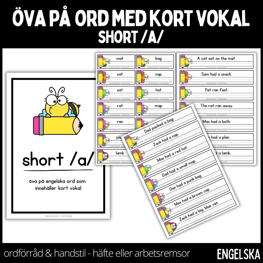 Arbetshäfte eller arbetsremsor, välj själv. Klipp ut remsorna, laminera dem och låt eleverna öva på engelska ord som innehåller korta vokalen a.