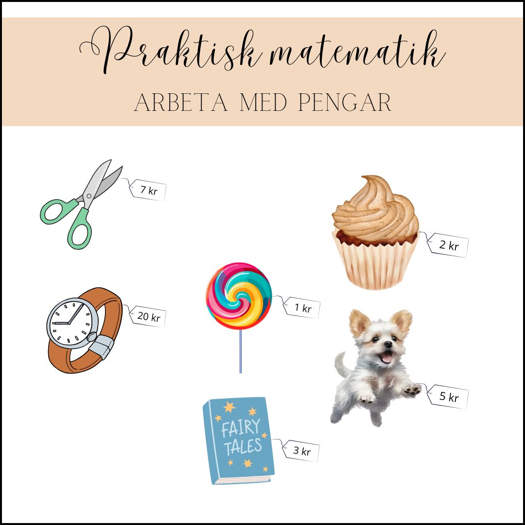Låt eleverna använda pengar och köpa olika saker i kiosken. Hur mycket pengar har de? Vad har de råd till? Hur mycket pengar har de sedan kvar?
