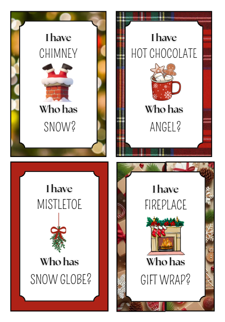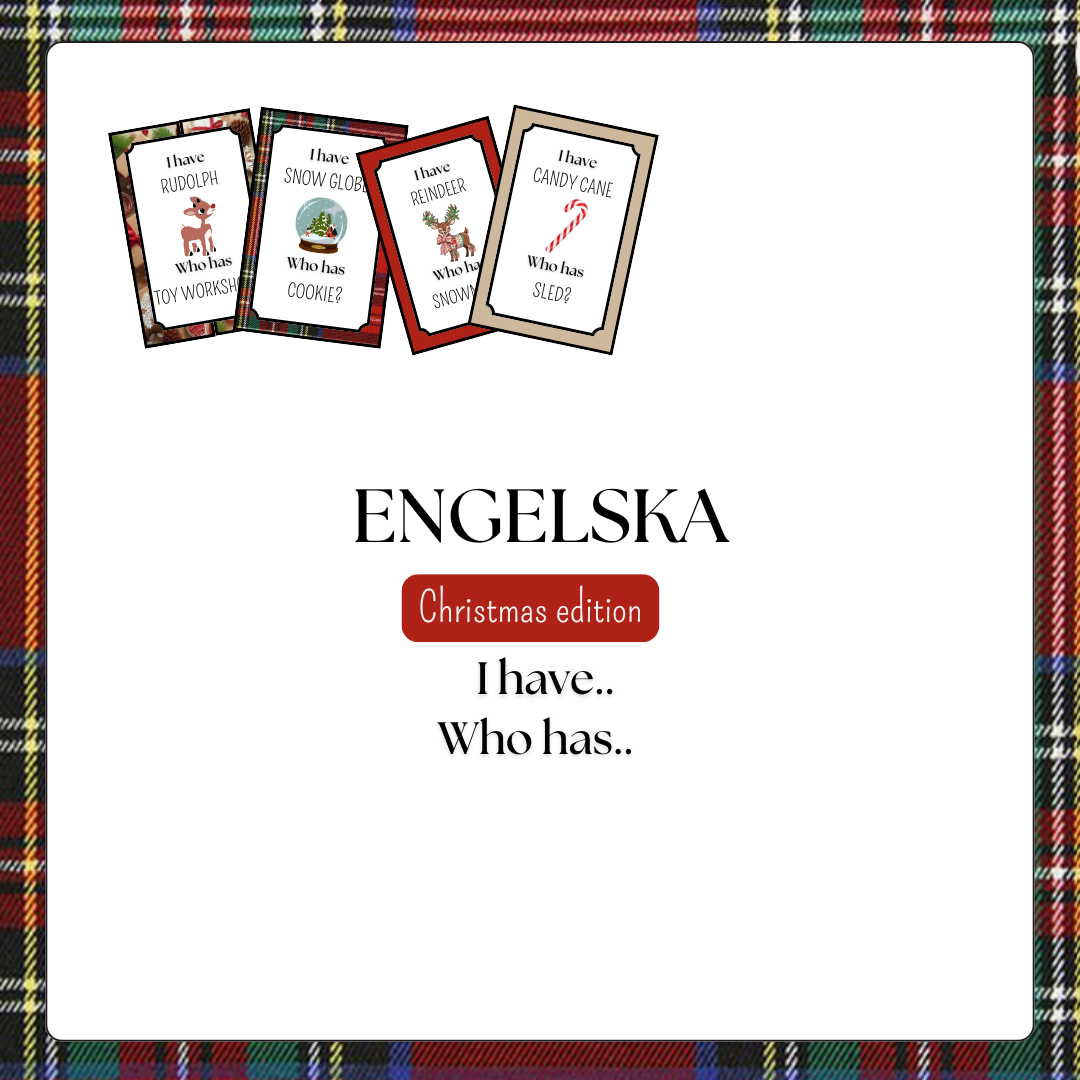 Orden: Santa, reindeer, snowman, christmas tree, stocking, gingerbread, presents, bells, snowflake, candle, ornament, wreath, elves, candy cane, sled, garland, hot chocolate, angel, star, christmas eve, chimney, snow, carols, mistletoe, snow globe, cookie, fireplace, gift wrap, Santa’s hat, north pole, Rudolph, toy workshop, sleigh, family, nutcracker och christmas card.