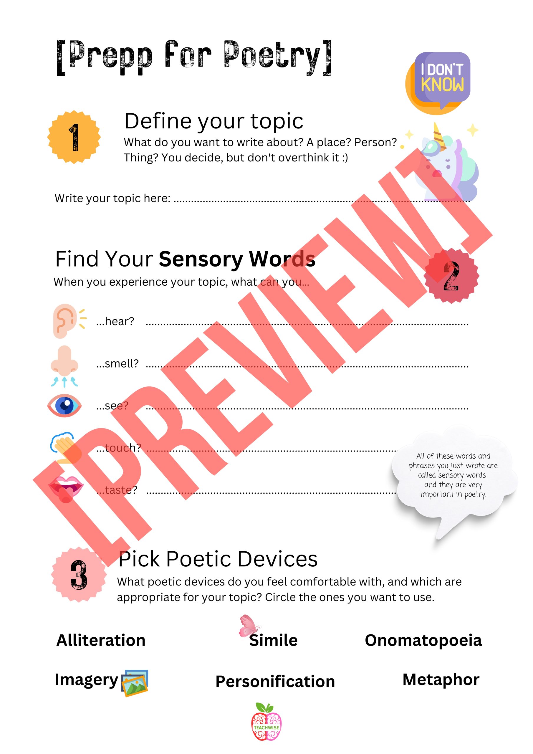 Från att samla tankar och idéer till att välja ämnen och utforska känslor – varje steg i formuläret är utformat för att vägleda eleverna genom processen av att förbereda sig för att skriva poesi.
