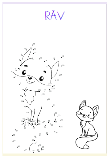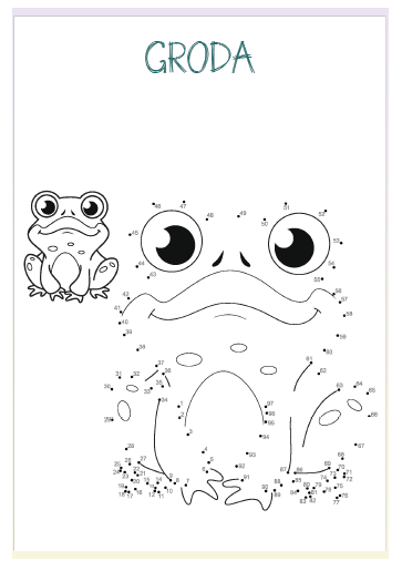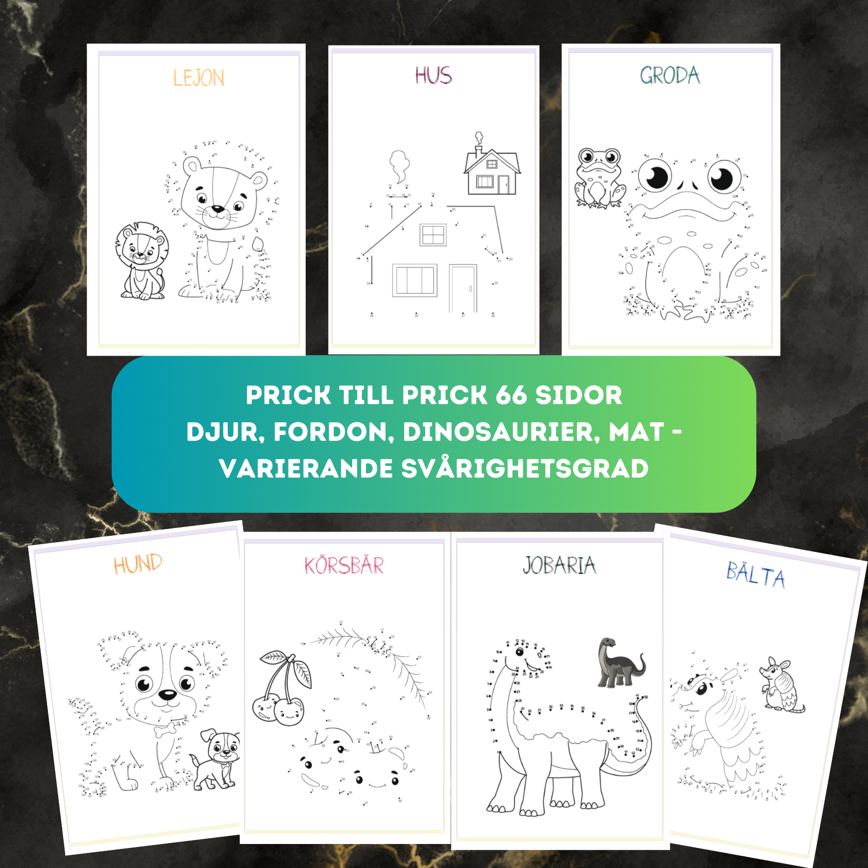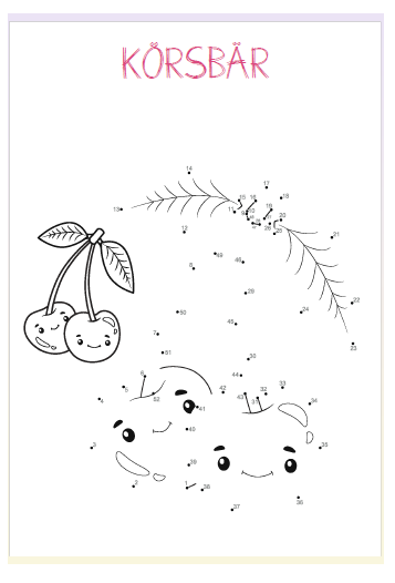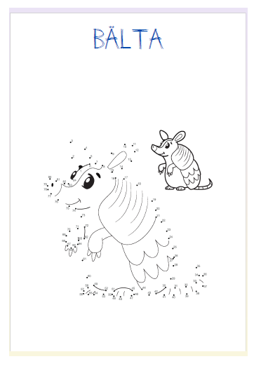 66 sidor med prick till prick övningar. Här finns flera olika sorters djur t ex bälta, lama, krokodil, hamster mfl. Här finns också dinosaurier, fordon, frukter och mat.