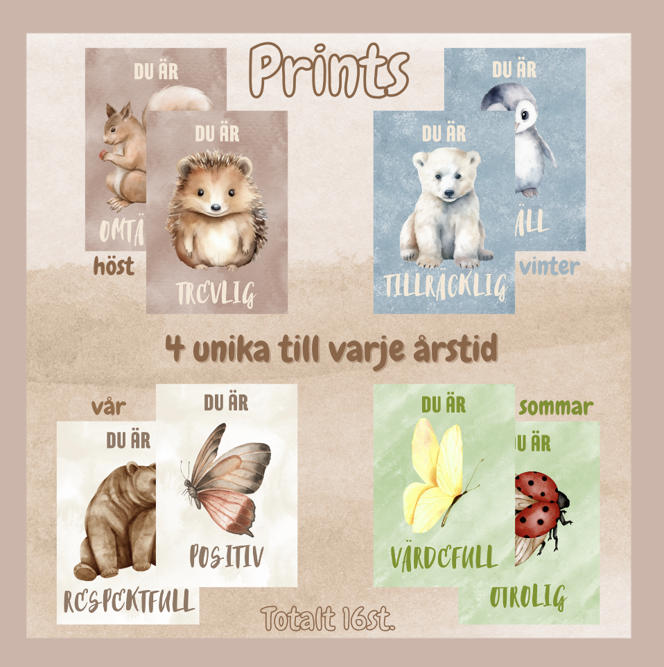 4 unika prints/affischer i A4-storlek till varje årstid (totalt 16 prints) med olika motiv och peppande ord att dekorera med på förskolan, i klassrummet eller på fritids.