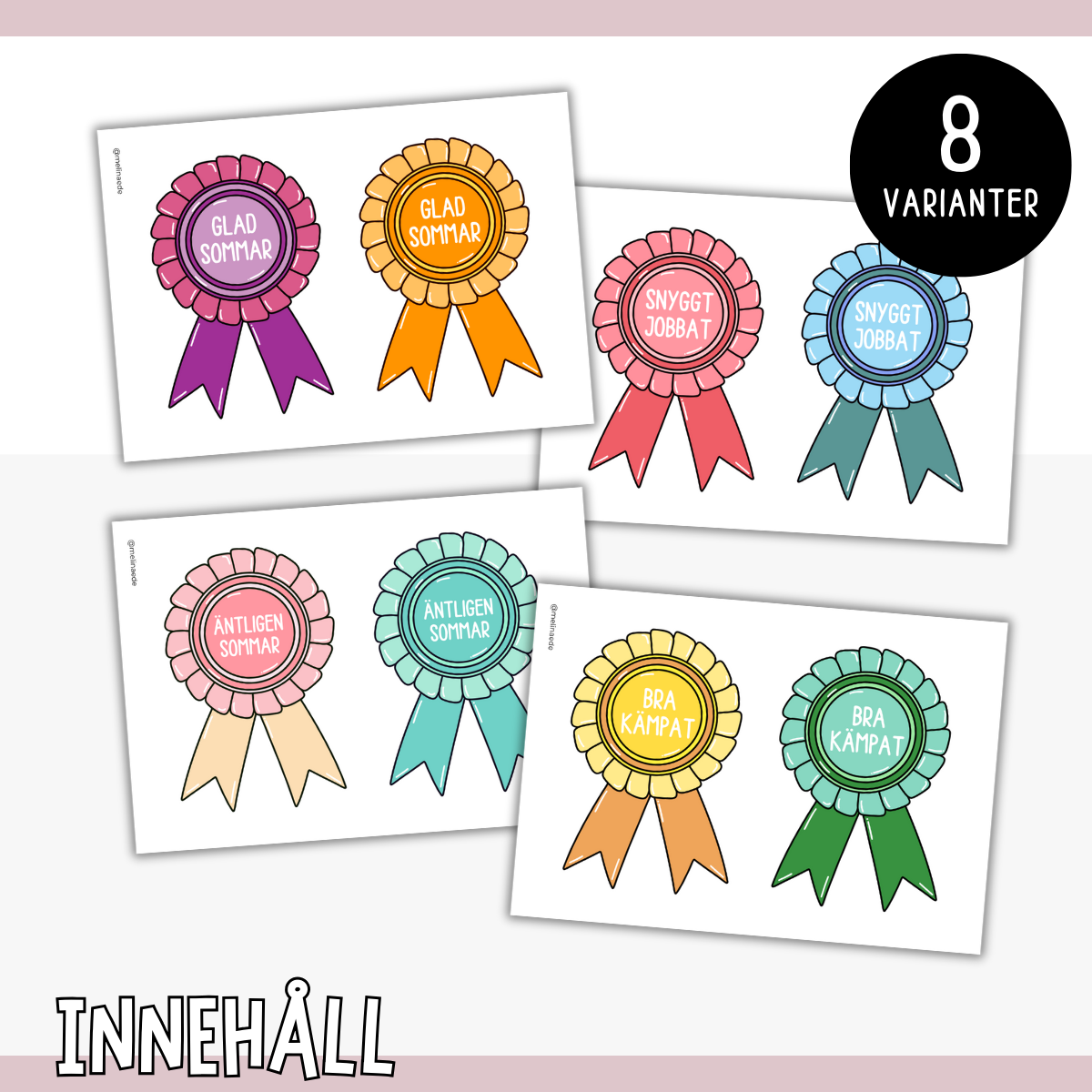 Ge eleverna en prisrosett på skolavslutningen inför sommaren. Innehåller prisrosetter med fyra olika texter (varje text i två olika färger)