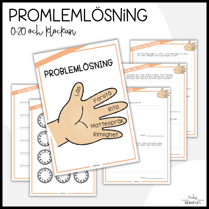 Ett häfte med 15 sidor problemlösning. Två problem på varje sida med varierande uppgifter inom talområdet 0-20 samt klockan. Häftet innehåller även klockor och tallinjer som eleverna kan klippa ut och klistra fast vid uppgifter där de behöver ta hjälp av dessa.
