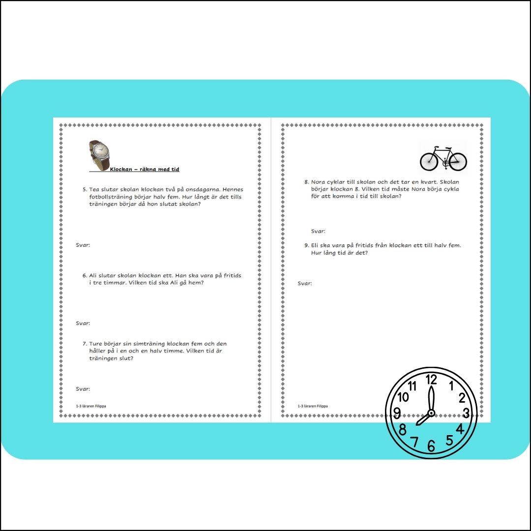Innehåller även textuppgifter med klockan, att räkna med tid.