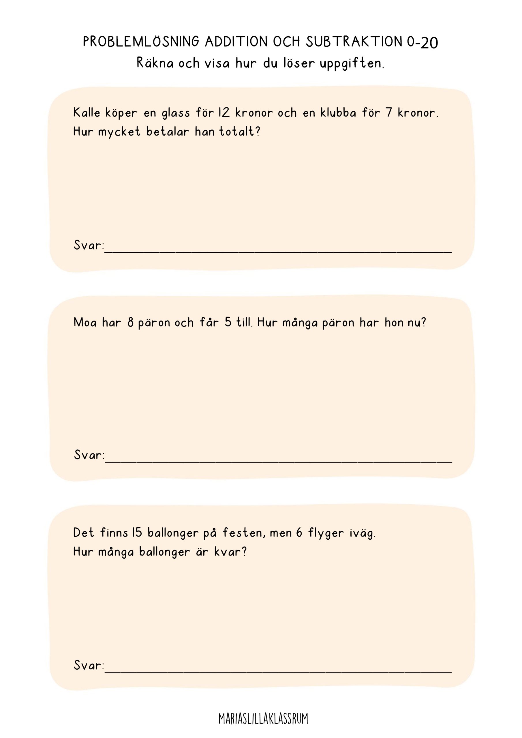 36 problemlösningsuppgifter inom addition, subtraktion, multiplikation, divison, geometri, mätning och tid. Anpassade för årskurs 2