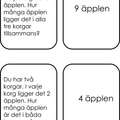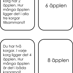 Materialet innehåller 4 korgar, 10 äpplen och 8 kort med problem för barnet att lösa. Det finns även 8 svart som man kan klistra fast på baksidan. Sedan finns det även ett ark med 2 tomma kort som man kan göra egna problem på.
