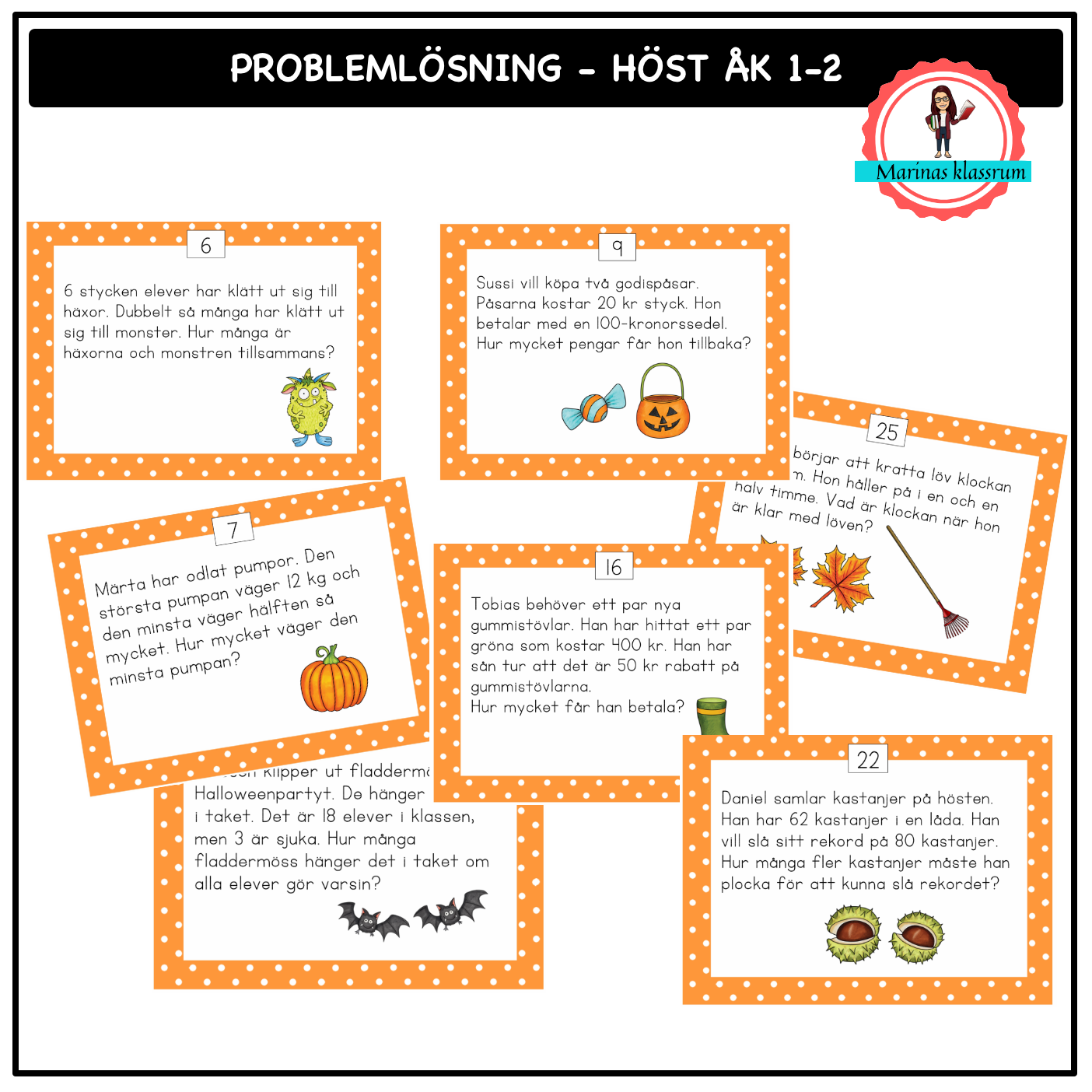 30 olika kort med matematiska problem. Korten har ett höst-tema och passar för elever i åk 1 och 2. Ett facit ingår till alla uppgifterna.