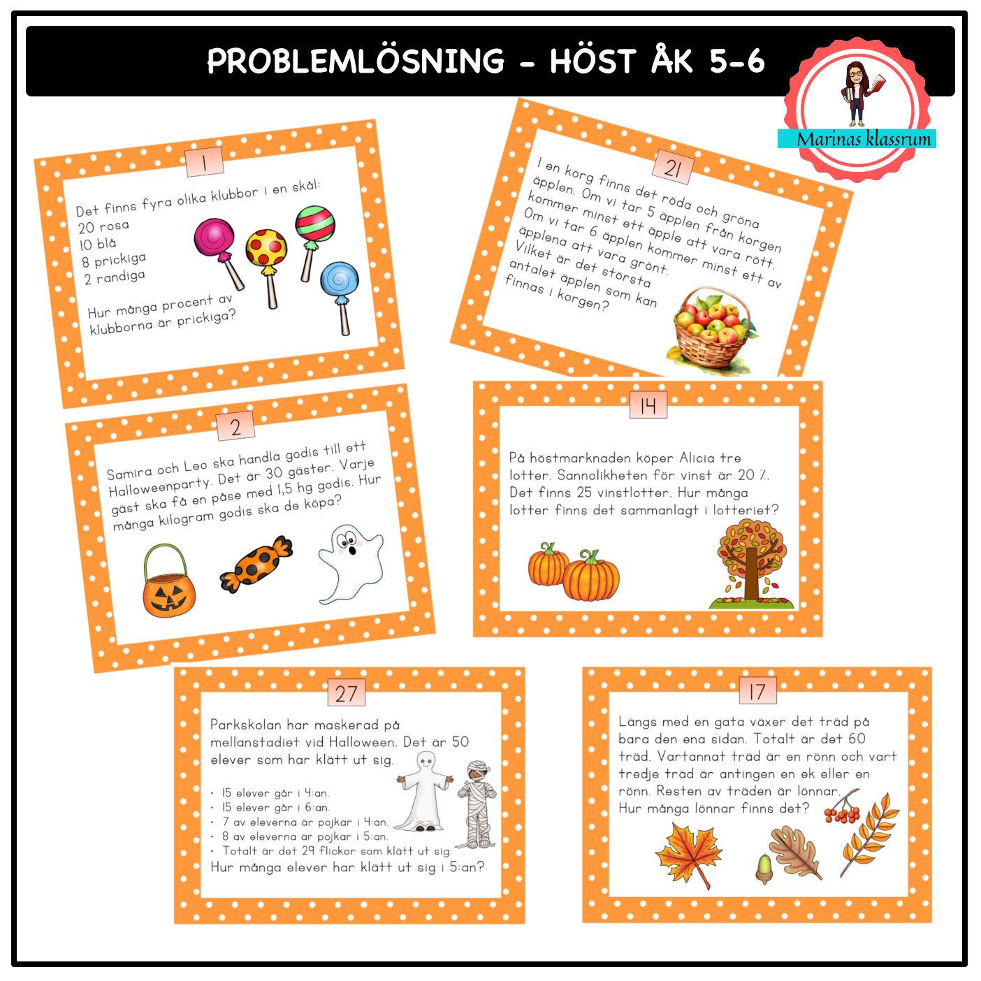 30 olika kort med matematiska problem. Korten har ett hösttema. Alla fyra räknesätten används och passar för elever i åk 5 och 6. Ett facit ingår till alla uppgifterna.