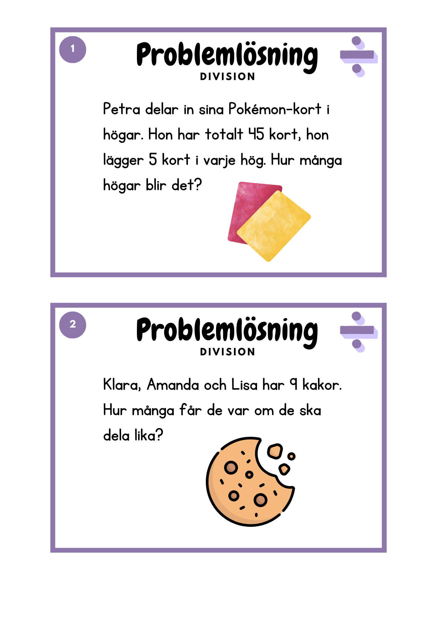 Problemlösning division (tabeller 2-10). Innehåller 30 stycken olika kort att skriva ut och laminera.