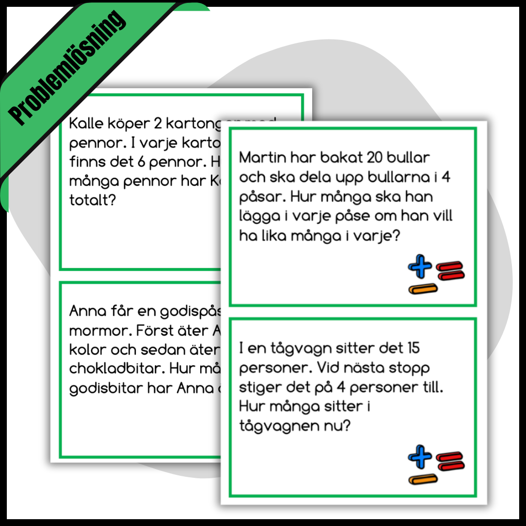 Här får du 14 kort med problemlösning/textuppgifter i matematik. Alla uppgifter är inom talområdet 0-20 och passar för årskurs F-2.
