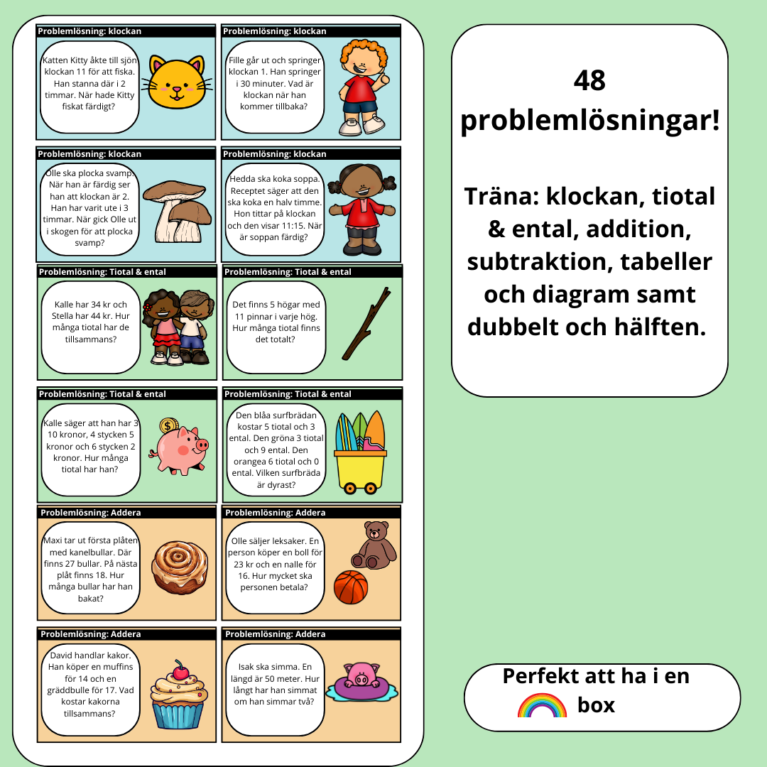 48 problemlösningskort inom olika kategorier. Till varje kategori finns 8 kort.