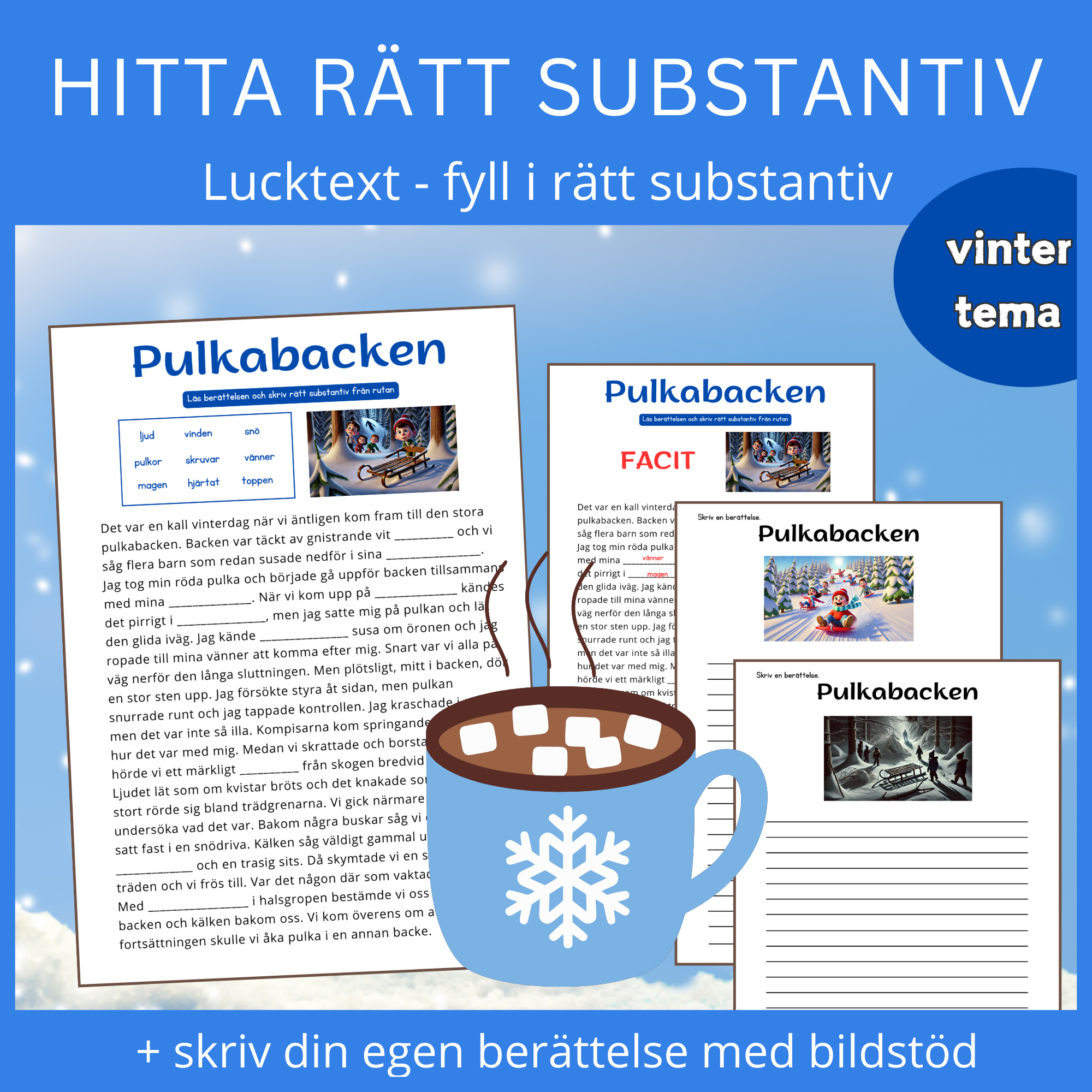 Detta ingår i Pulkabacken – Lucktext, fyll i rätt substantiv + skriv din egen berättelse till bild