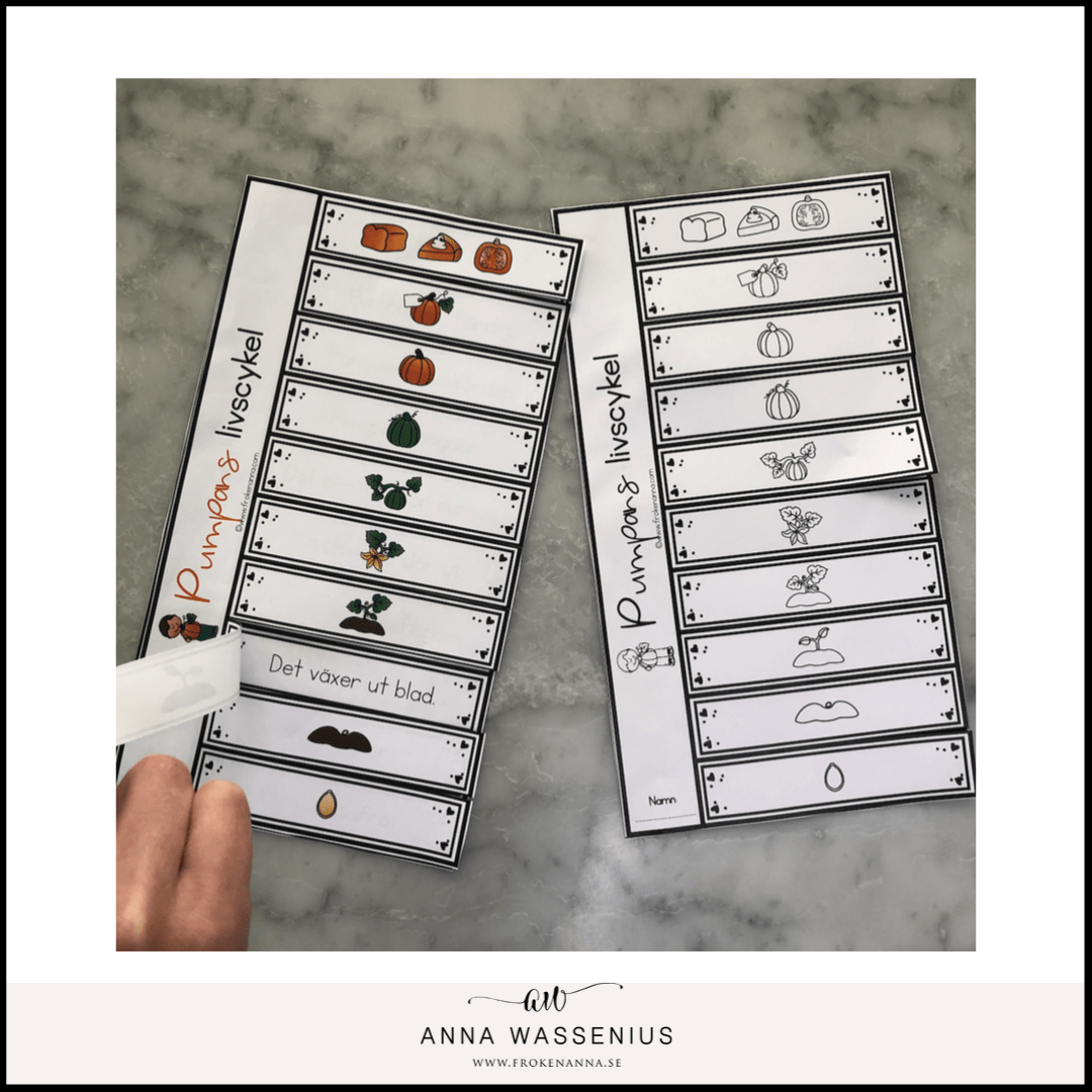 - Bilder över pumpans livscykel till lärarens demonstration. Sätt med fördel sedan upp bilderna på tavlan eller en vägg så eleverna kan bekanta sig med cykeln efteråt. (Dessa finns enbart i färg)