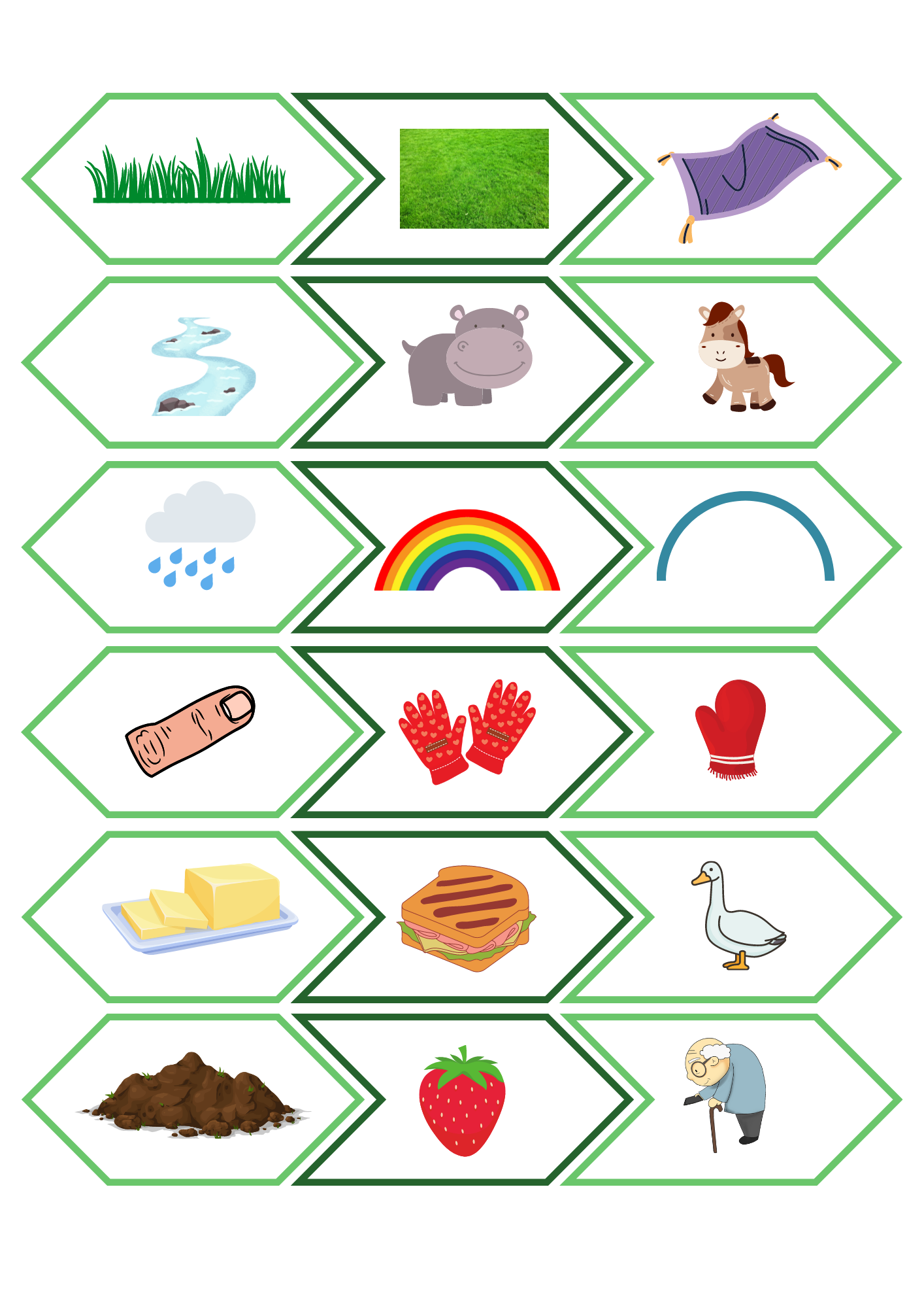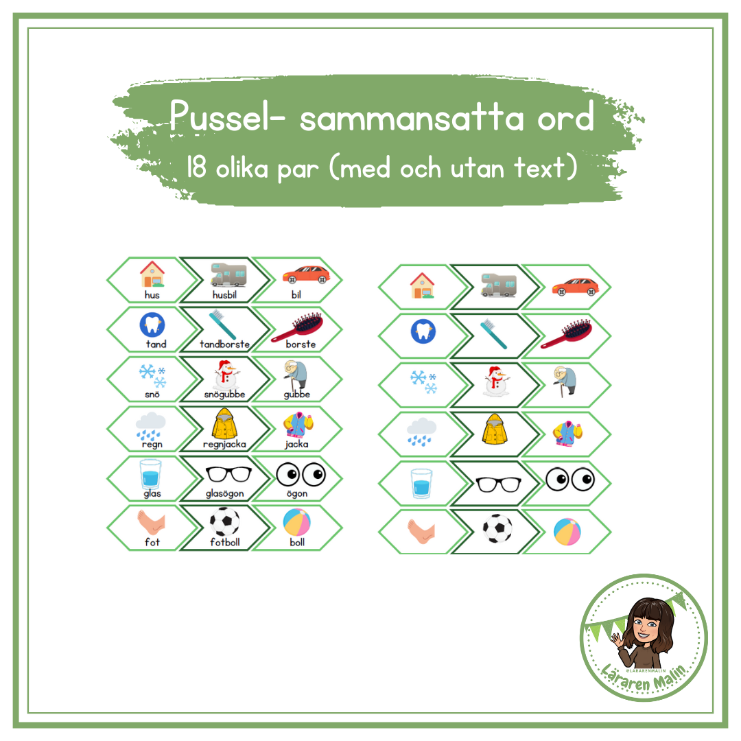 Pussel med sammansatta ord. Totalt 18 olika sammansatta ord. Medföljer med och utan text. Till varje sammansatt ord hör 3 st ”bitar”/kort.