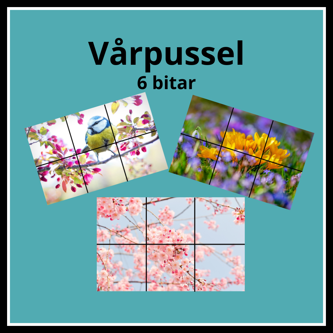 Materialet är pussel med 6 bitar med temat vår och natur. Till de yngre barnen kan man skriva ut pusslen i två exemplar och laminera det ena pusslet som en mall så kan barnen lägga bitarna på rätt plats.
