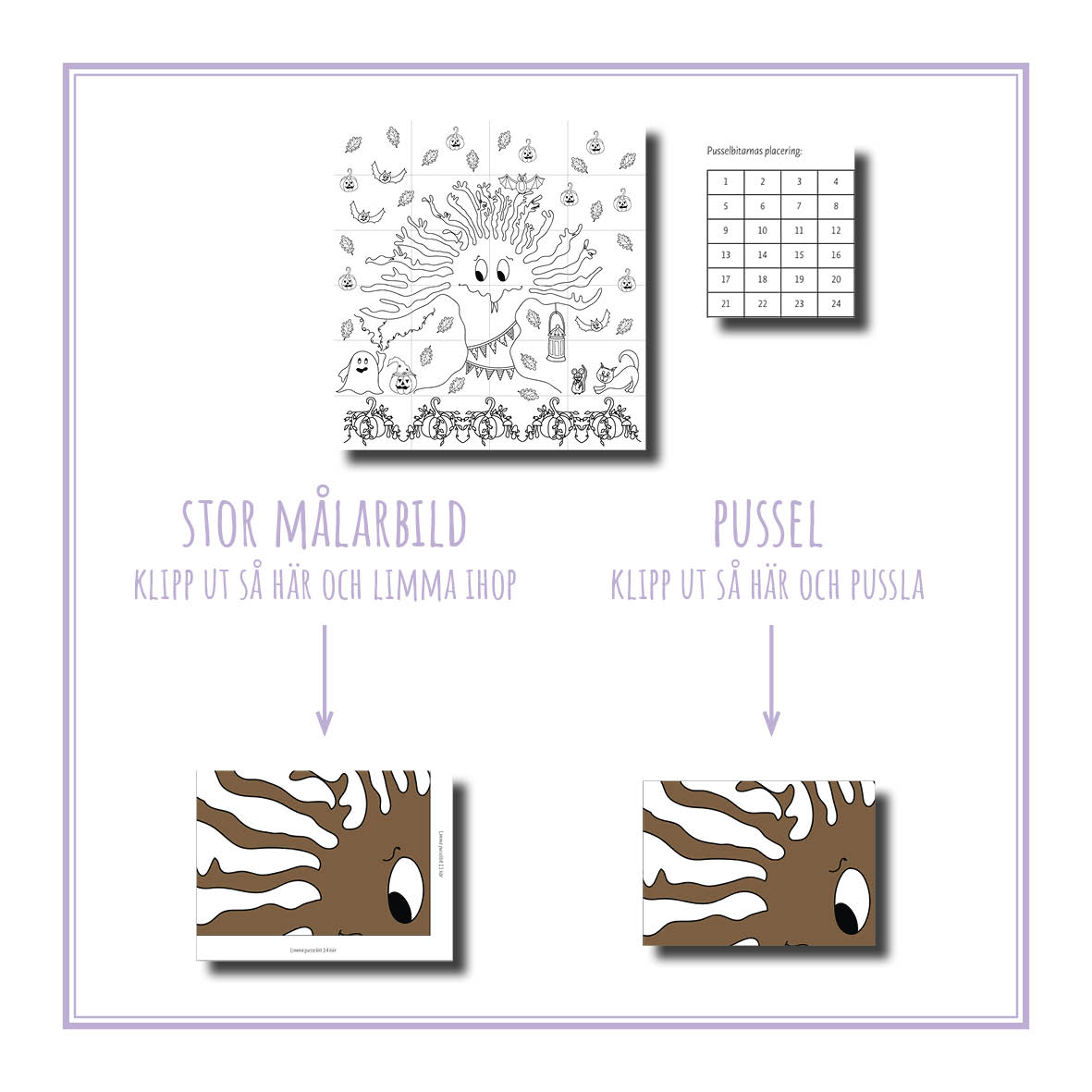 Pusselteckning Halloween Det skrämda trädet är ett roligt och annorlunda halloweenpyssel. Färglägg och sätt upp det färdiga motivet på väggen eller laminera och använd som ett vanligt pussel. På pusselbitarna finns remsor att limma på och instruktioner för vilka bitar som ska monteras var.