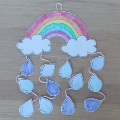 Pyssla en regnbåge med droppar som kan fästas med trådar under regnbågen. Färglägg och klipp ut.
