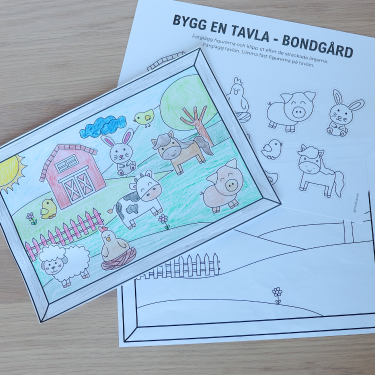 Gör en tavla med tema bondgård. Färglägg och limma fast figurerna på tavlan.