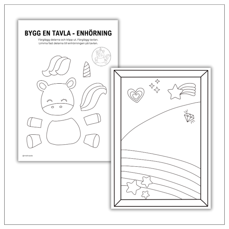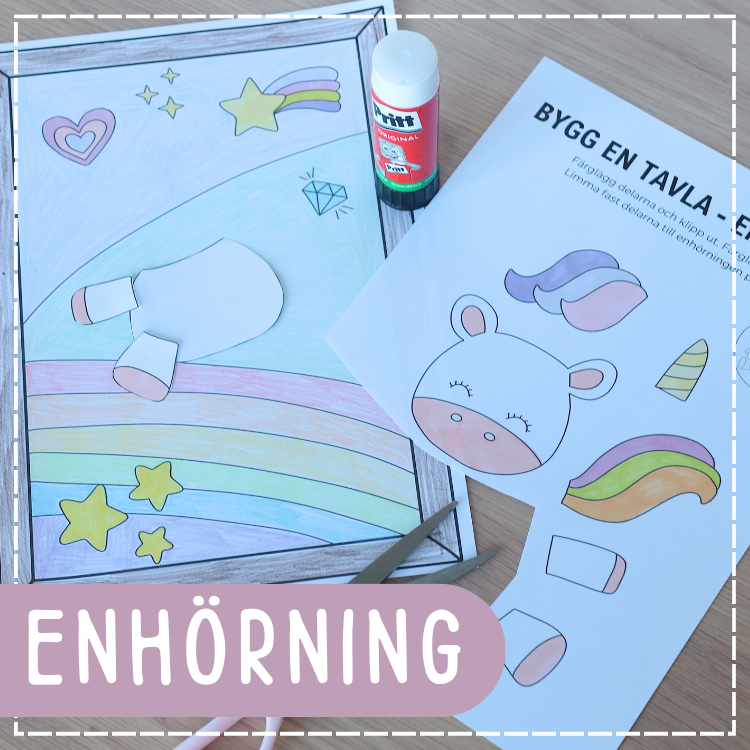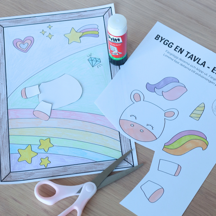 Gör en tavla med en enhörning. Färglägg, klipp och limma fast enhörningens delar på tavlan.