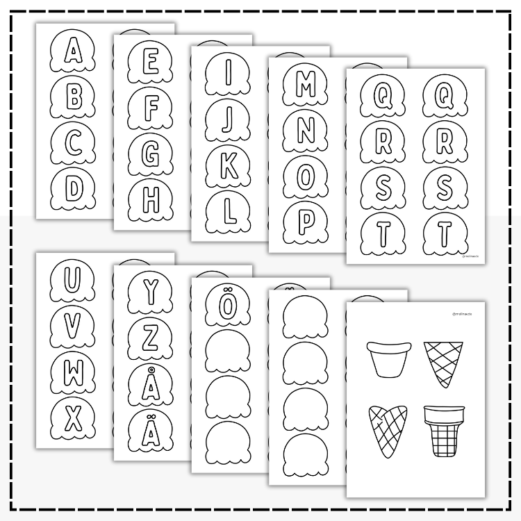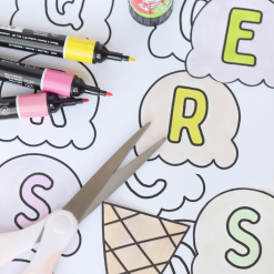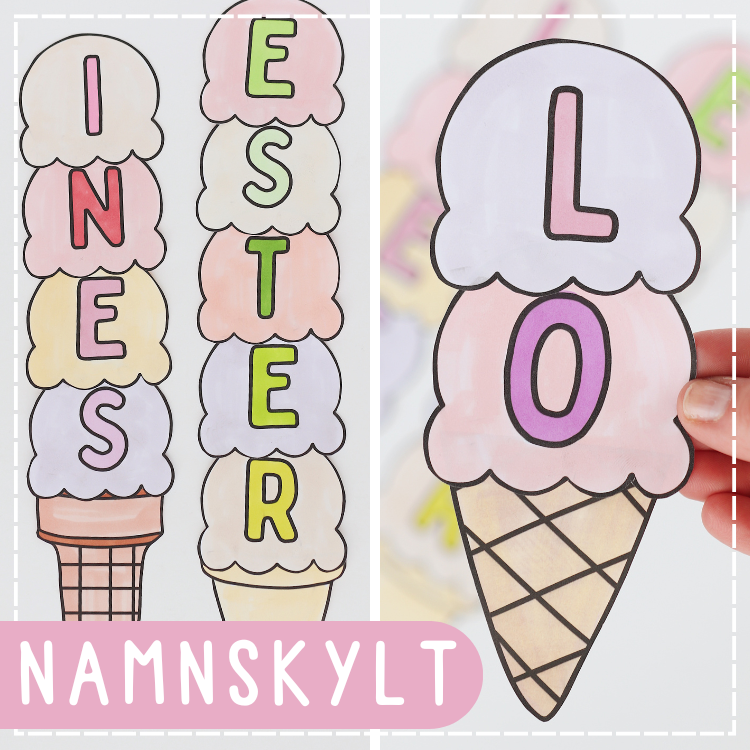 Pyssla en namnskylt i form av en glass. Låt barnen klipp ut, färglägga och limma ihop sitt namn. Innehåller