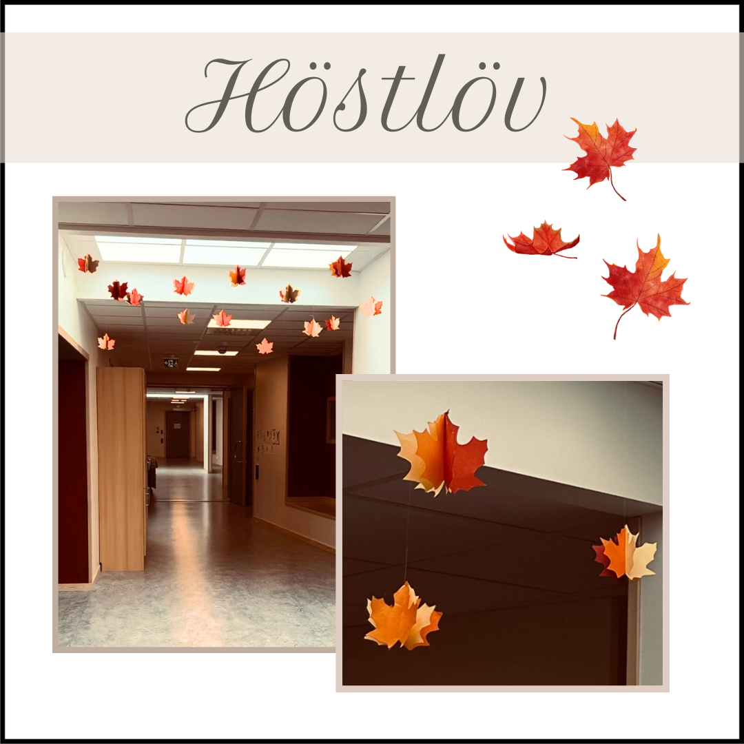 Material: Mallar, höstfärgat papper (brun, gul, orange, röd), häftapparat, sax, nål och tråd, blyertspenna.