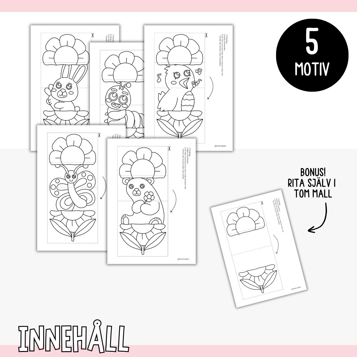 Innehåller Fem blommor med färdiga motiv: fjäril, björn som håller i en blomma, larv, fågel som kvittrar och kanin med en morot
