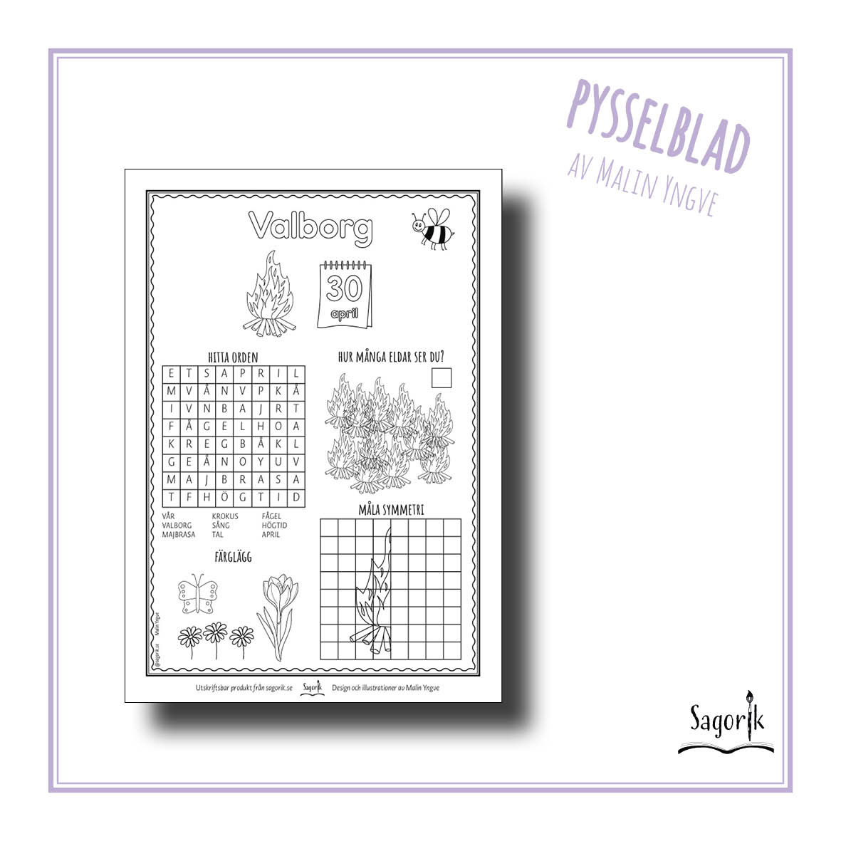 Pysselblad Valborg är en sida med illustrationer att färglägga, sökord, räkna antal och måla symmetri. Passar även som startuppgift i skolan.