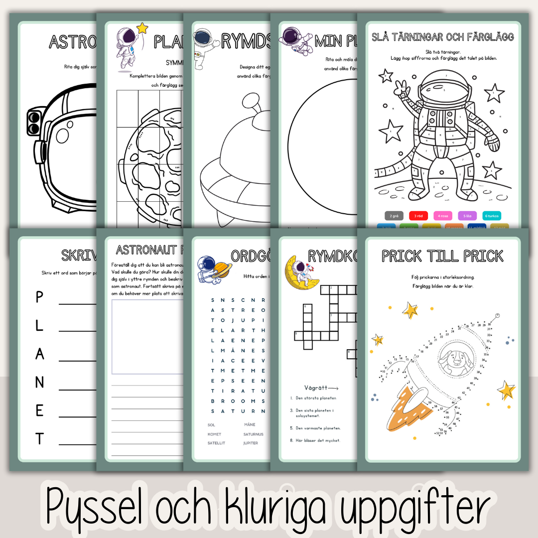 Pysselhäfte med tema rymden. 25 sidor fyllda med kluriga, roliga och pedagogiska uppgifter. Facit medföljer.