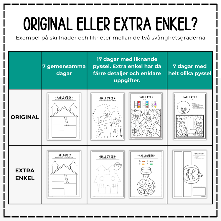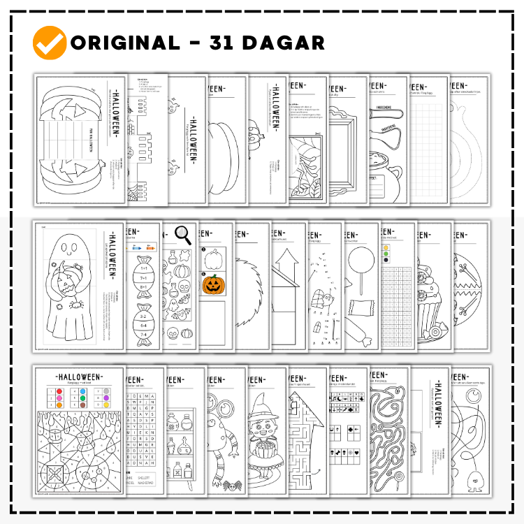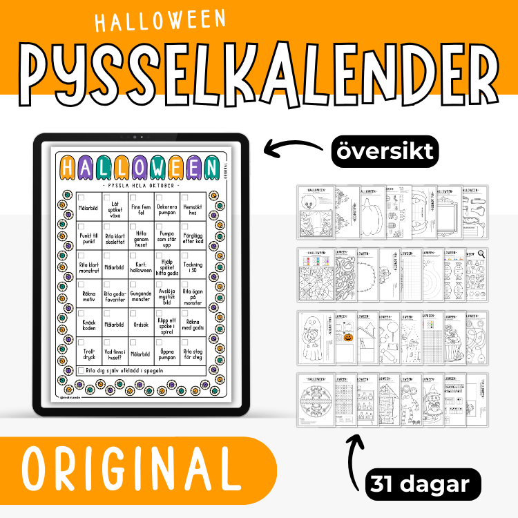 Kalender med halloweenpyssel och kluringar till alla 31 dagar i oktober. Den enklaste genvägen till en oktober där barnen alltid har något att göra, utan planering eller lång förberedelse innan.